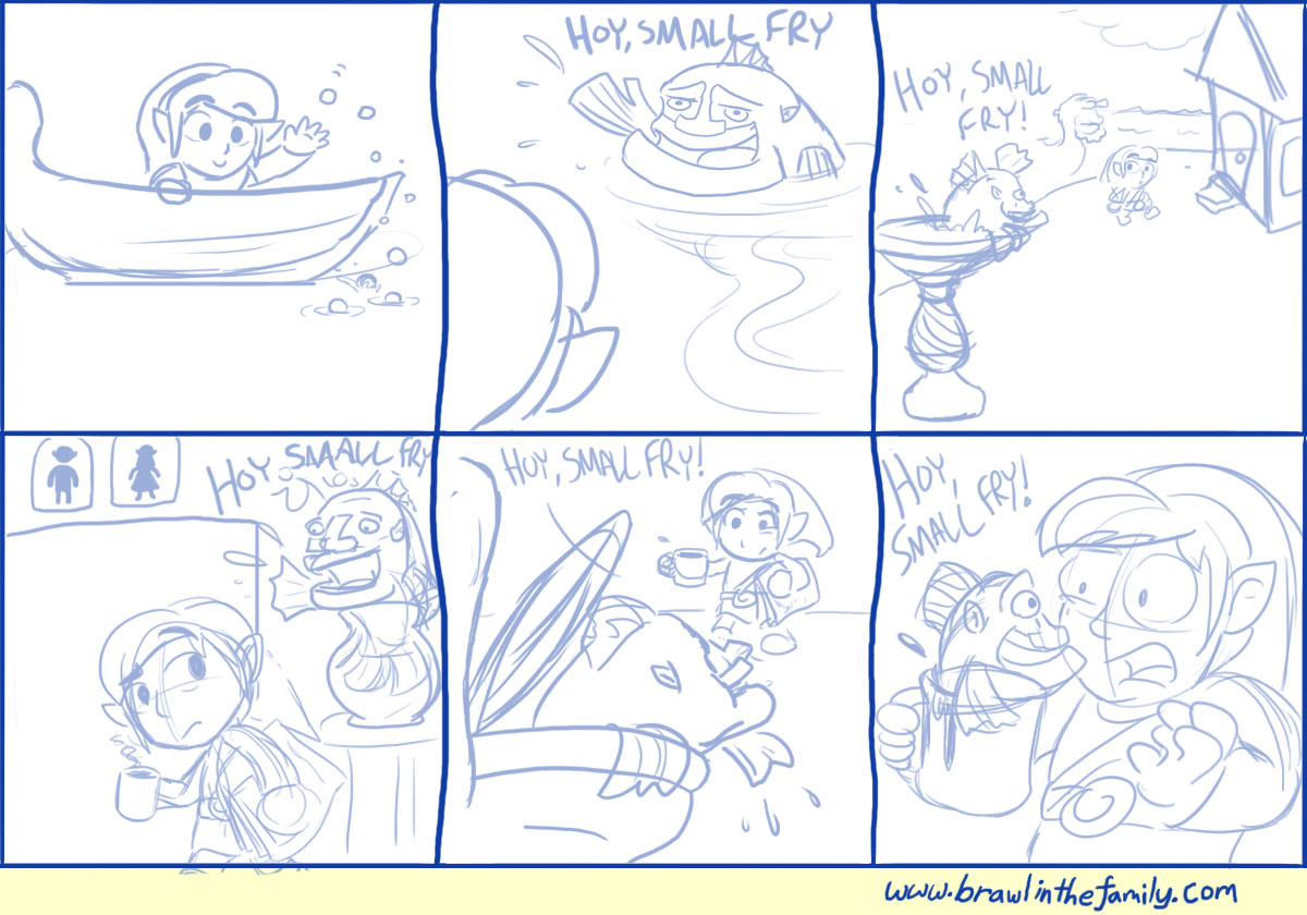 Today's comic went through a bit of a change. One idea was simply having the Man-Fish pop up in all sorts of crazy, watery areas, regardless of how absurd (you can see a rough sketch of the original strip here, pardon the poor art). But then, with some help from Chris, I merged that concept with an older, too-offensive-for-BitF strip idea I had to come up with this final not-very-offensive strip that I think turned out well. It's a weird concept--apparently adding stuff to a liquid will summon the fish--that I hope comes through clearly enough here.