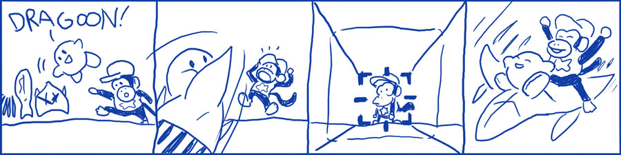 In today's comic, Kirby displays woeful ignorance towards the most basic element of defeating an enemy combatant: perceiving them as a threat. Will this naiveté lead to a gruesome end for our oblivious hero? Only time will tell, dear reader.