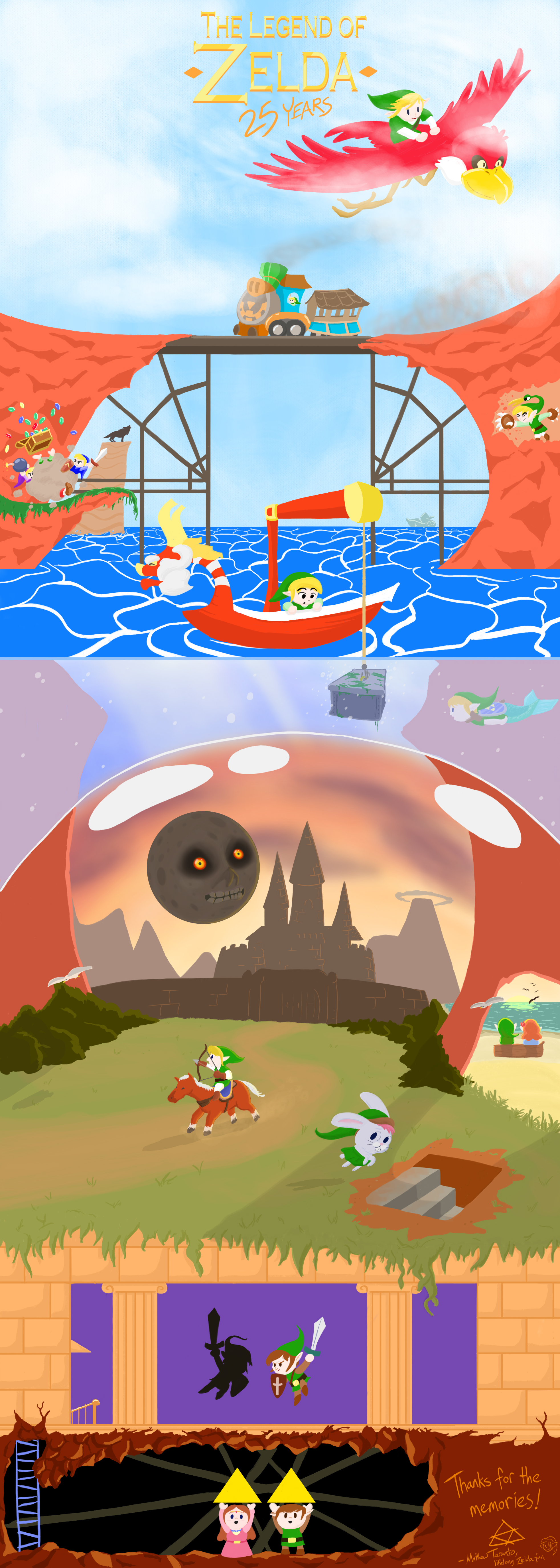 Happy 25 years to The Legend of Zelda! Today's update isn't a comic but it's something I wanted to do, despite the many required hours of work this week. Zelda has always been my favorite series due to its overwhelming sense of adventure and exploration, its charming atmosphere and cast, it's strong overworld and dungeon design, and memorable soundtrack, and the newest chapter hits here in the US in only a couple days!