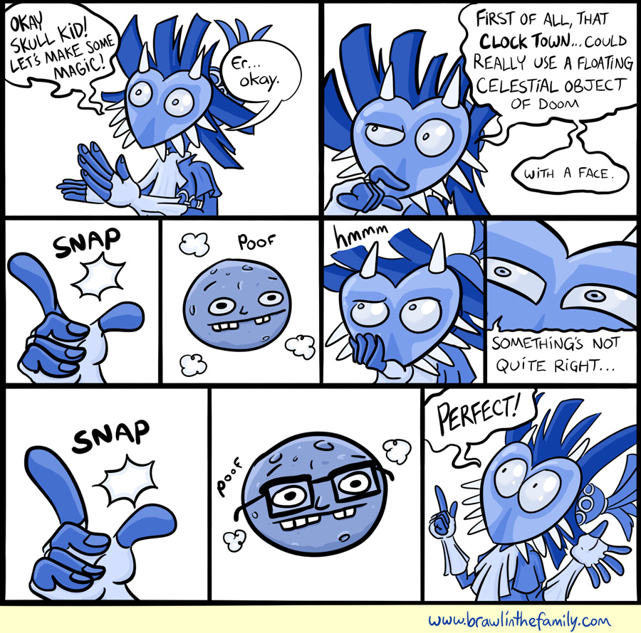 Today's rather silly adventure was originally even sillier! But after brainstorming a bit with Chris, it did bug me that the moon in the game didn't end up looking like that, so I worried that would affect the enjoyment of the strip. So we hashed it out and the solution ended up being fairly simple--just have Skull Kid be the odd one, and have the humor arise from his tension with Majora's Mask. The result is a character pairing that I rather like, although it was pretty difficult to clearly distinguish the two personalities for the viewers' sake.