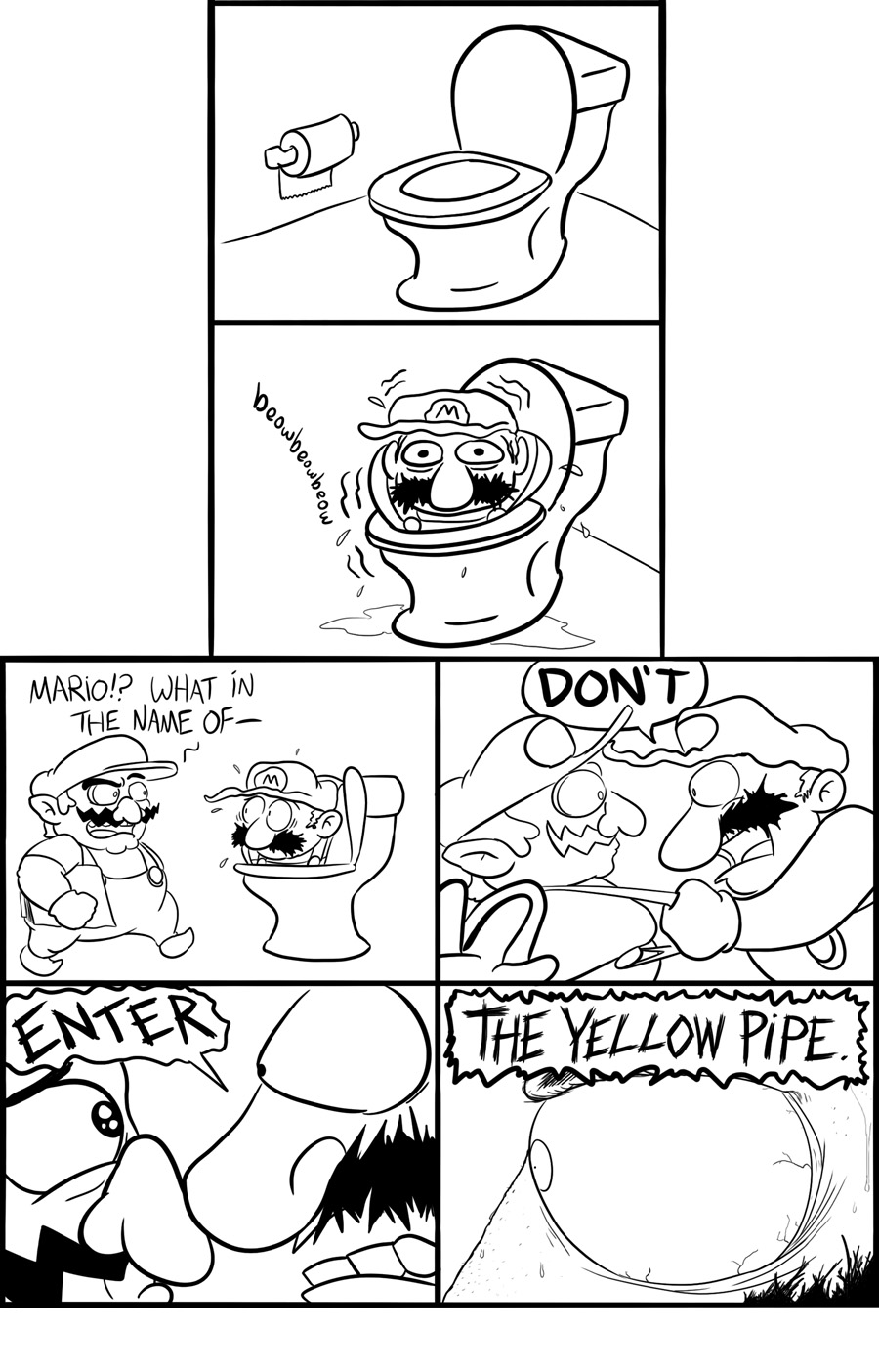 This is another strip that went through a little tweaking! Take a look at an early version of the initial idea. It's basically about Mario taking the wrong pipe and ending up in just about the worst place possible, but his desperate words of warning were a little vague to have the right impact (after all, there are "yellow pipes" everywhere). At any rate, I enjoyed playing with the expressions as usual, particularly Wario's quick change from amusement to terror.