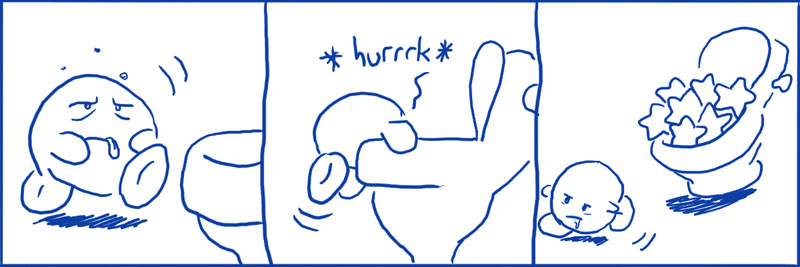 Poor Kirby. After a mouthful of hair, paint, and Wario soup, his stomach can't take much more of this. Don't worry, though, he'll be happy and healthy next time around.