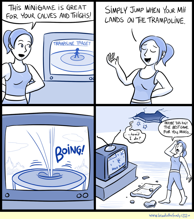 Between this incident and Bowser breaking the darn thing when he tried, Wii Fit Trainer is hoping to go back to more normal clientele.