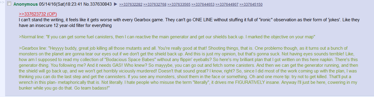 Is this guy a writer for Gearbox? That said some of it's pretty hilarious.