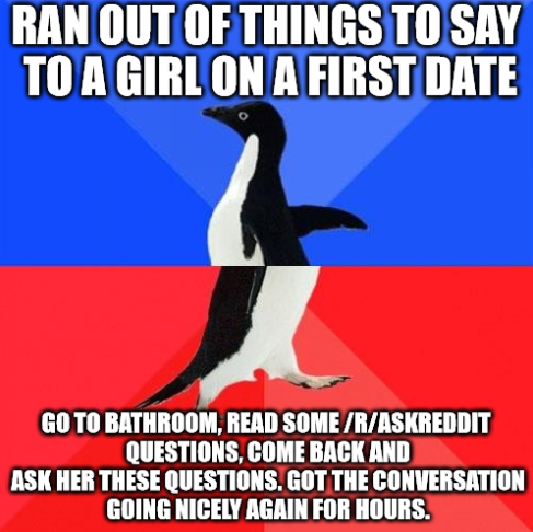I was on a date last night and I was pretty sure my date was using questions from Reddit. .... Chris?