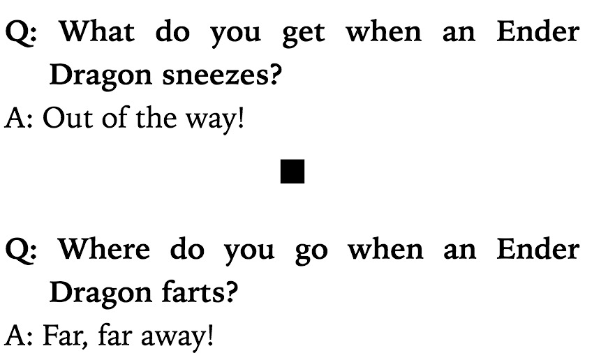 These jokes were opposite each other on a double-page. Are you kidding me? Look, authors, if you couldn't come up with 800+ Minecraft jokes, that's fine, but don't say there are 800+ jokes in your awful book!