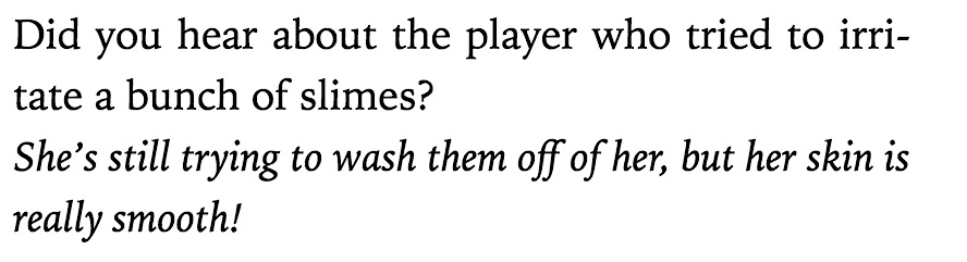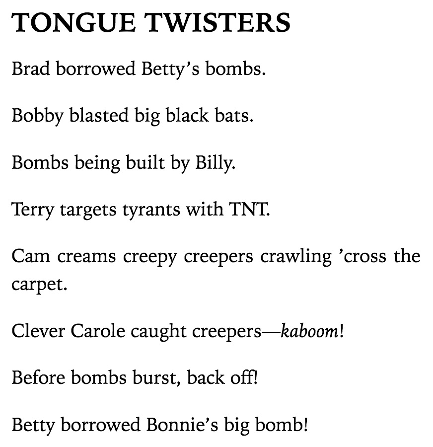 Sometimes these tongue twisters are added into a chapter. They're... okay, I guess? Nothing compared to "the sixth sick sheik's sixth sheep's sick". So, I'll skip most of these.