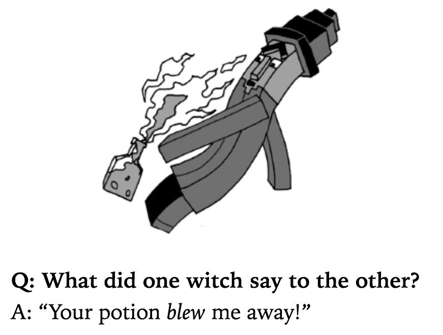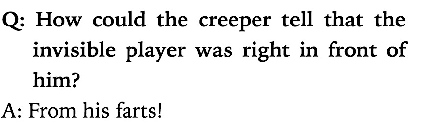 These jokes were opposite each other on a double-page. Are you kidding me? Look, authors, if you couldn't come up with 800+ Minecraft jokes, that's fine, but don't say there are 800+ jokes in your awful book!