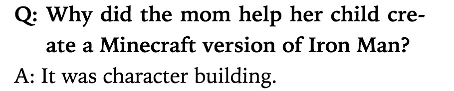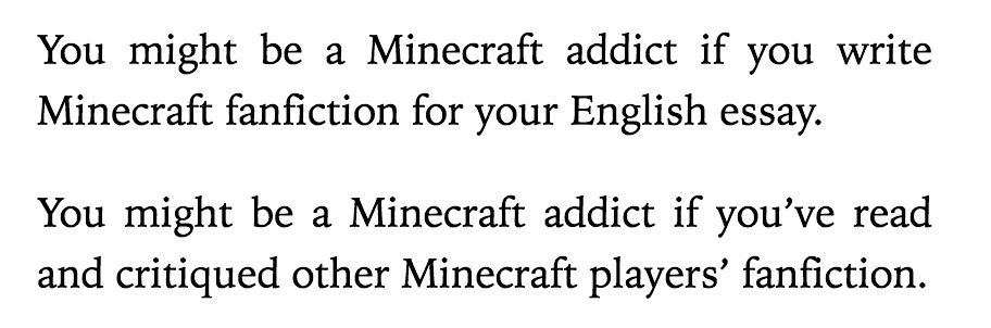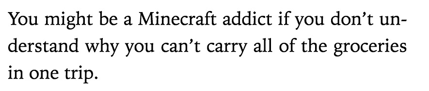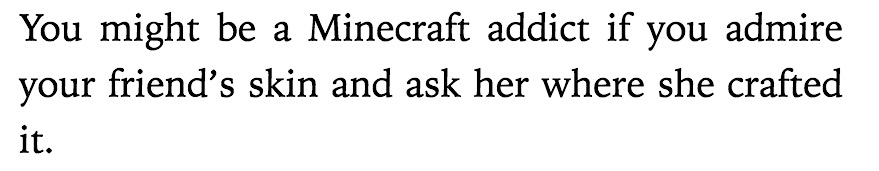 "Honey, can you help with the groceries?" "Sorry, mum, I'm a Minecraft addict. Can't help you."