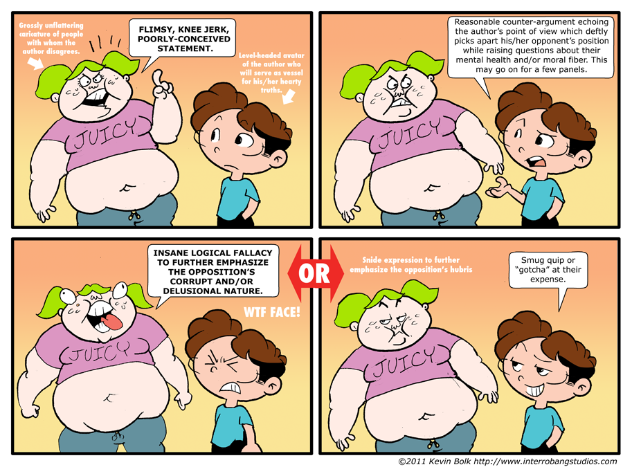 The worst part about the OP comic is that it doesn't even have the "rational character" disproving the other character. She just smugly insults him.