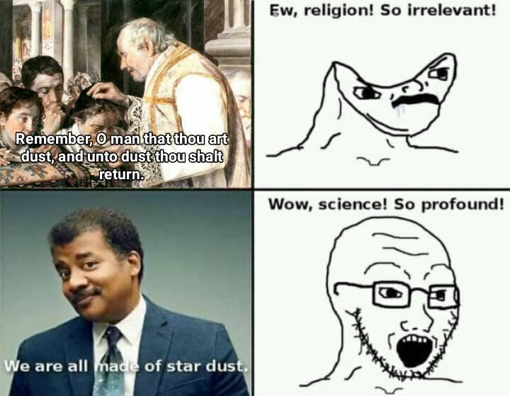 I'm not even religious but acting like "We're all made of star dust" is some sort of profound life changing idea is ridiculous. Anyone with three brain cells and a basic understanding of how chemistry/physics works understands that us being made of star dust is nothing special because EVERYTHING is made of star dust.
