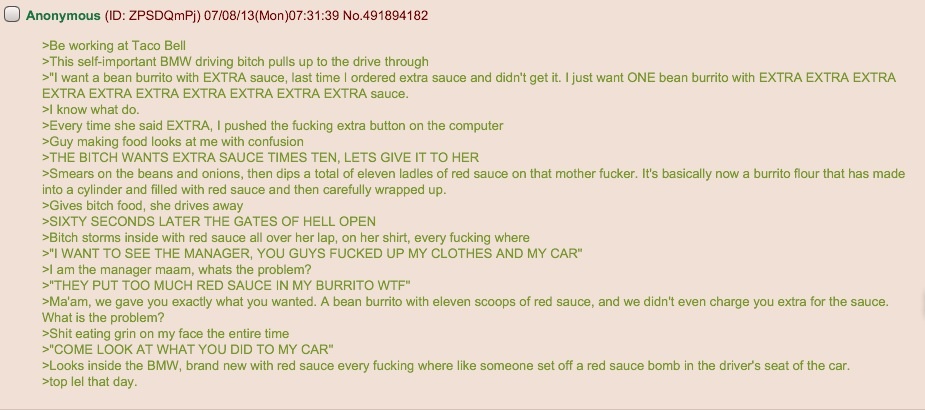 Who reads a greentext for reality? I want a ludicrous story of hilarious bullshit.