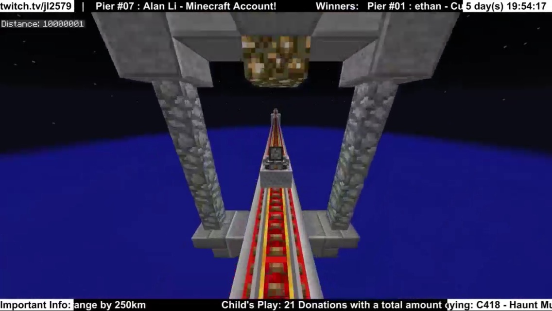 Yeah, this stream definitely isn't a typical stream. I'm not sure how familiar you are with JL and the Zipkrowd, but the group is filled with minecrafters who push the game to it's limits. They were the ones responsible for that nether TNT video a few weeks back. IMO, it's interesting to see the person who constantly pushes the game to its limits finally break the game. It also puts the numbers into perspective; reading that it takes 17 days to travel to the end of minecraft via minecart is interesting, but watching it happen in real time actually gives a feel for the amount of time 17 days actually is. The C148 music is also awesome!