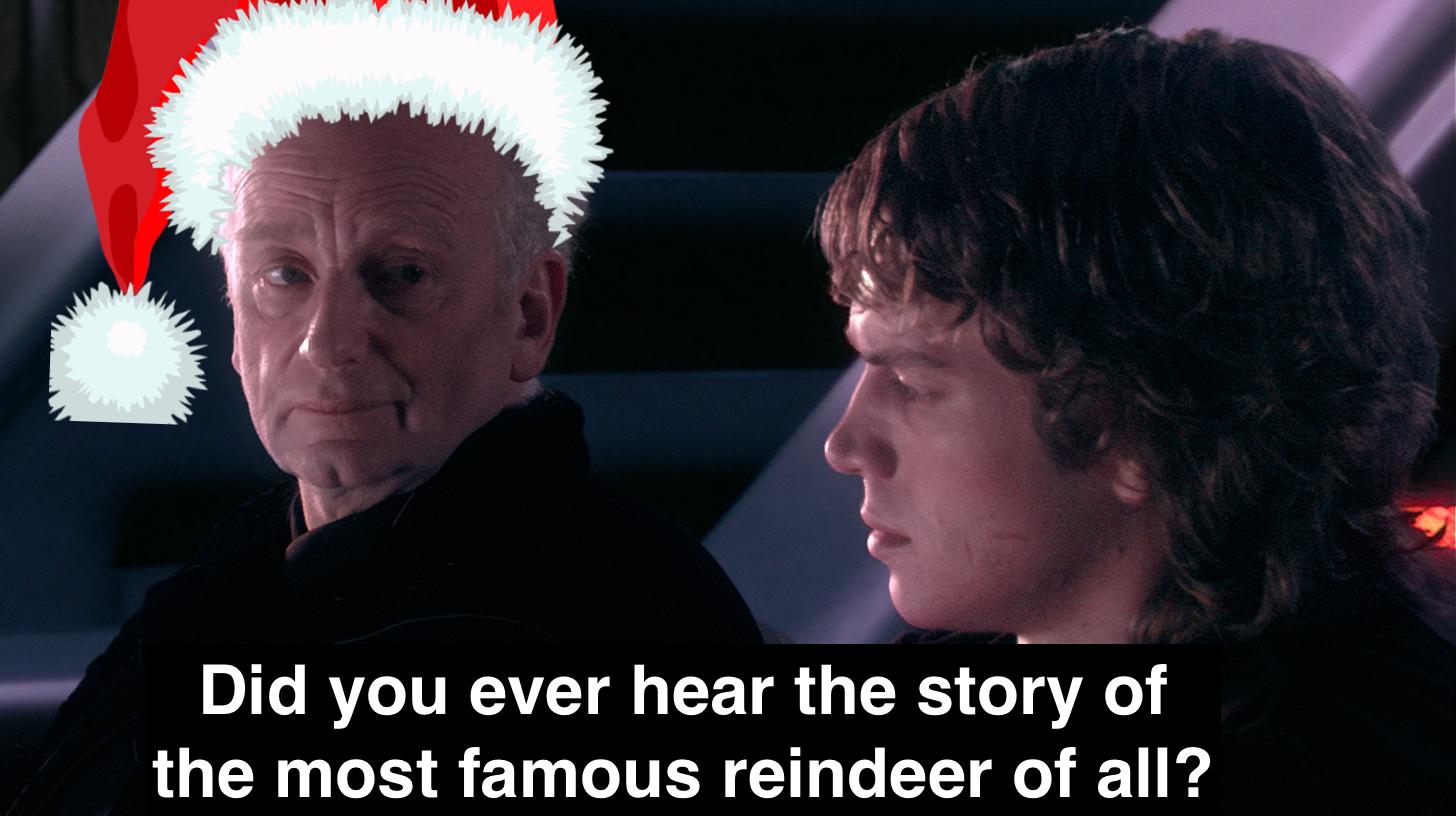 Did you ever hear the tragedy of Darth Rudolph the Red-Nosed Reindeer. I thought not. Itโs not a story the elves would tell you. Itโs a Sleigh-puller legend. Darth Rudolph was a Dark Reindeer of the Sleigh, so powerful and so bright, he could use Christmas Magic to influence his nose to create... light. He had such a knowledge of Dark Christmas Magic he could even light the way for Santaโs Sleigh. The Dark side of Christmas is a pathway to many abilities some consider to be unnatural. He became so popular... the only thing he was afraid of was losing his popularity, which eventually, of course, he did. Unfortunately, he was blinded by his nose, so Santa put headlamps on the other reindeer and left him home to sleep. Ironic. He could light the way for others, but not himself.