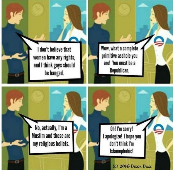 I bet you're a gay white male, you don't rank high enough on the oppression pyramid to have an opinion on Muslims! In fact, you should stone yourself as punishment for your privilege.