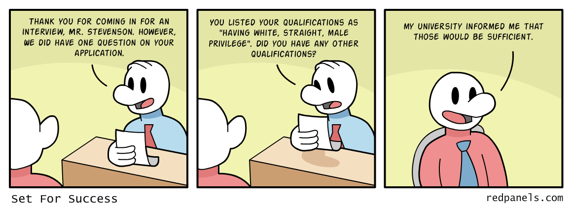 Story of my life. "Oh, you're a white, college-educated male?...no thanks. Best of luck to you."