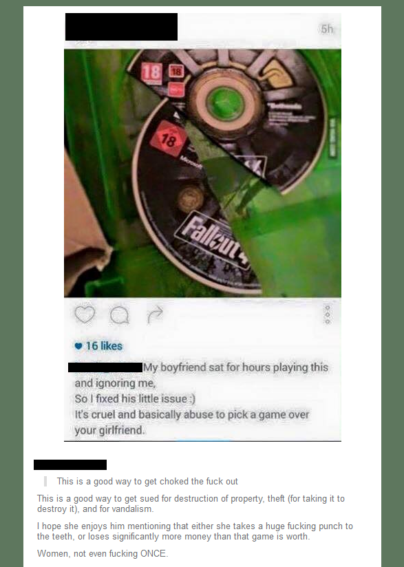 Not gonna lie, if my GF somehow purposefully ruined my copy of FO4, bitch gonna get smacked.