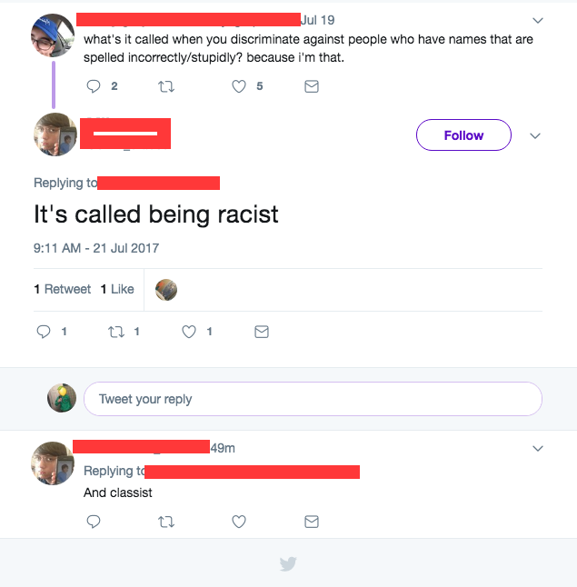 So if you're going to say "it's called being racist", you have to assume that - when race isn't mentioned at all - that non-whites are the only people with names "that are spelled incorrectly/stupidly". That assumption is racist.