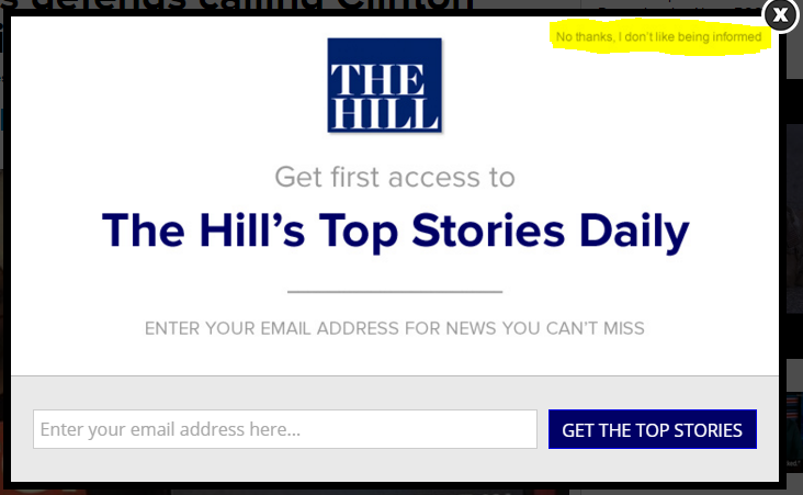 I was on the women's health website and it told me to enter my email address for a free meal plan. The only way to close that window was to click "no thanks, i don't want to lose weight"
