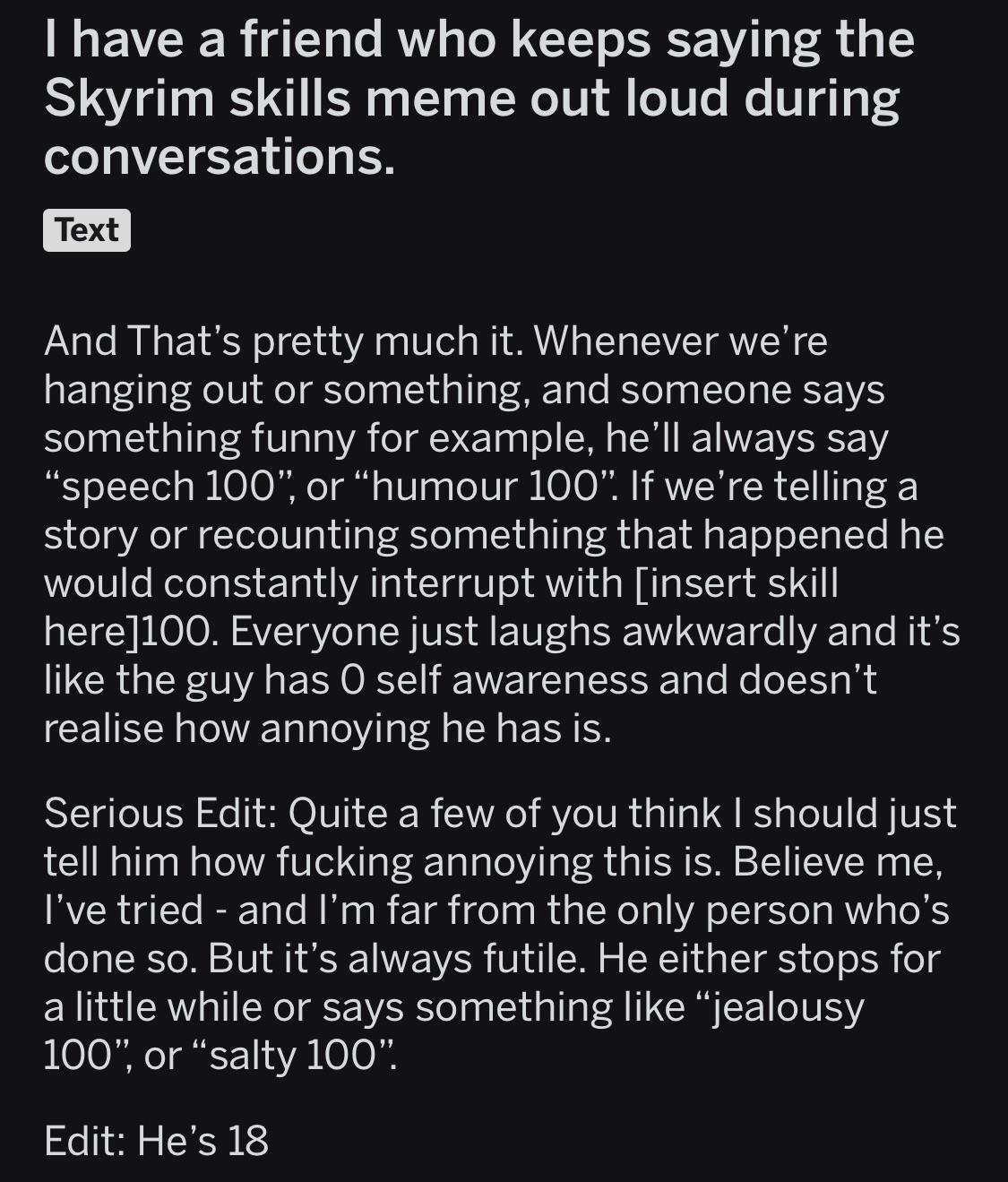 And Thatβs pretty much it. Whenever weβre hanging out or something, and someone says something funny for example, heβll always say βmuhfuggen bix noodβ, or βwe waz kangzβ. If weβre telling a story or recounting something that happened he would constantly interrupt with [insert statistics here]. Everyone just laughs awkwardly and itβs like the guy has 100 self awareness and doesnβt realise how baste & redpilled he has is.