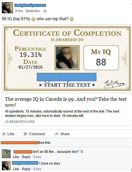 It's a stupid fb thing that automatically posts it. She didn't actually write that, or take the test. This is the top post on cringepics?