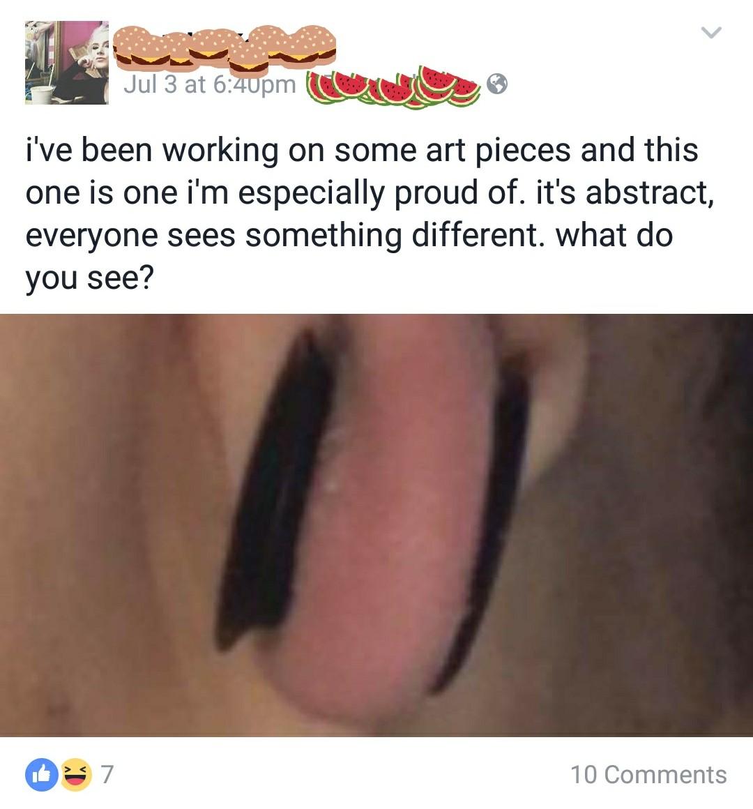 Despite the gross ear, I applaud OP's use of burgers and watermelon slices to hide the ... "artist's" identity. I enjoyed a bit of whimsy as a break from the usual colored scribbles.
