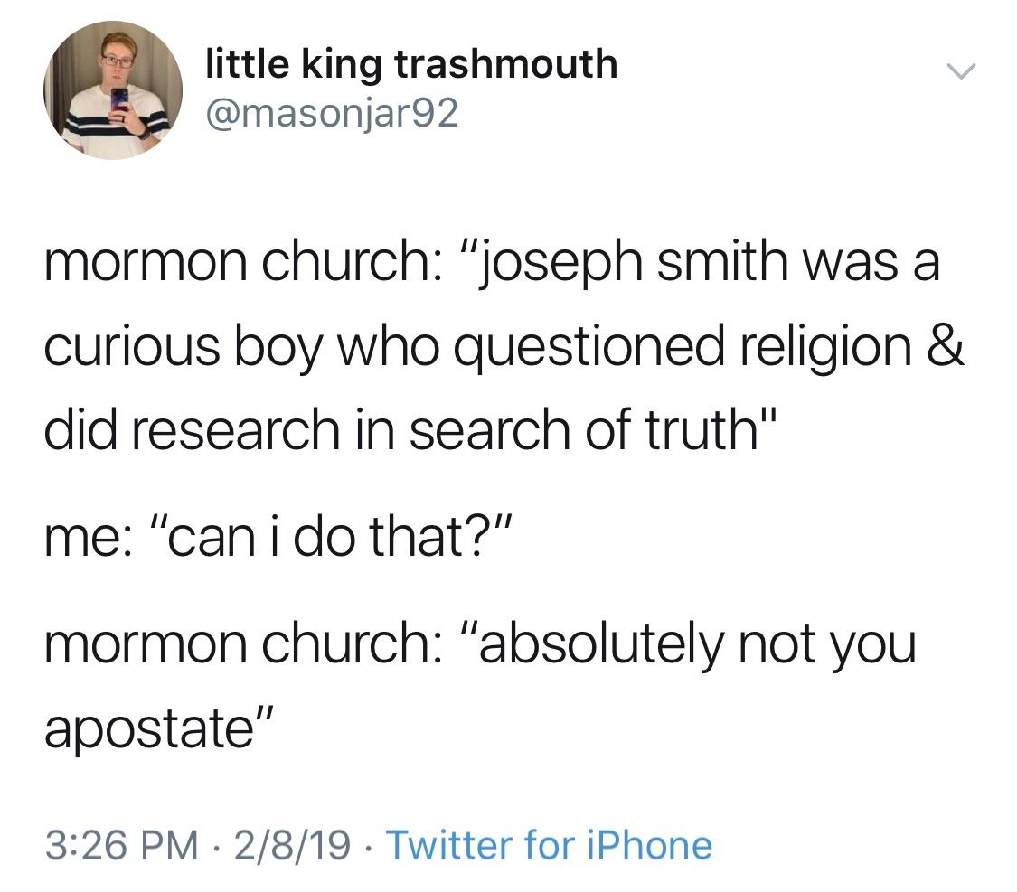 haha the people who were defending the church in replies to this tweet are ridiculous. Based on their replies they all never heard the church leaders tell people not to research countless times, or they only read the preface of the CES letter and only researched using fairmormon lmao.