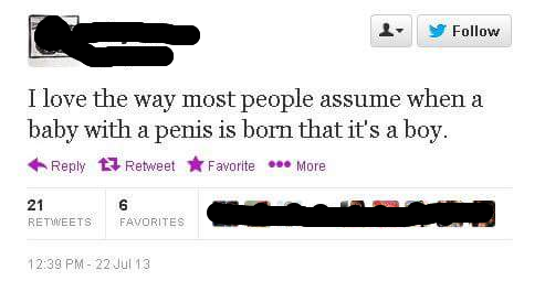 Having time to complain about the oppression of the cock and say things like "that baby isn't a boy just because it's a boy" is privilege. Oh I'm tickled by the notion.