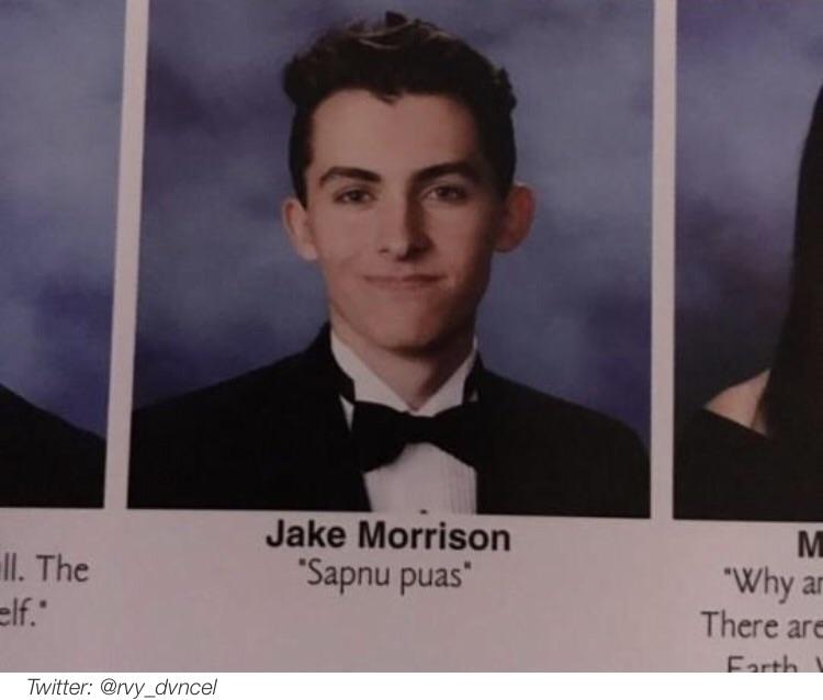 Exactly. I can picture this kid with all his bros. He's probably called the Jakester and all his boys have sick nicknames too and after this yearbook came out words like epic were tossed around as they high fived each other furiously. I imagine his daily uniform is a button up shirt with the sleeves rolled just right, pink or some version of red/pink shorts, and boat shoes with no socks.