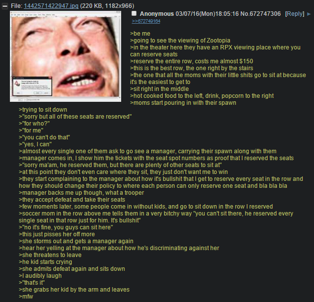 The whole point of all of this was that the greentext doesnt make sense because those "moms" wouldnt have freaked out if they were in a theater where everyone had an assigned seat because what would they be so appaled about? If the theater HAD assigned seating, they all would have already known that.
