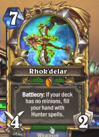 I actually have no problem with the idea of a new hunter condition for cards and not having any minions was interesting, but why are those cards this awfully costed? This is build your deck a certain way, wait till turn 7 (or until you will have drawn all minions, which will take a while, because Hunters have no draw) then equip a 4 attack weapon and better have an empty hand to gain random hunter spells. It is a legendary weapon with a huge deckbuilding restriction, but it won't actually win you the game, because Hunter spells right now are very risky. It could have been this exact card, without the deckbuilding restriction, it could have been a different effect like "Whenever your hero attacks fill your hand will hunter spells". Random Hunter spells wouldn't break Hunter right now. This feels very underwhelming for a legendary weapon. This isn't feeling powerful, this is measly, it isn't even actually meme-y.