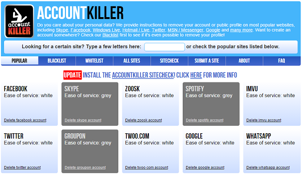 #16 - AccountKiller.com guides you on how to delete your online accounts from popular websites.