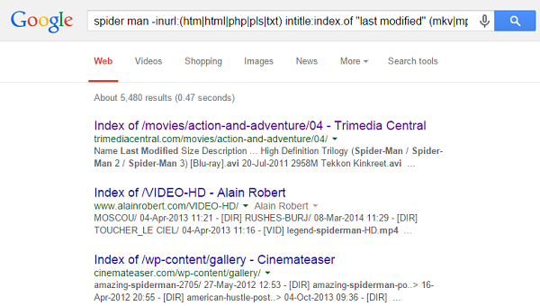 Example: spider man -inurl:(htm|html|php|pls|txt) intitle:index.of โlast modifiedโ (mkv|mp4|avi)