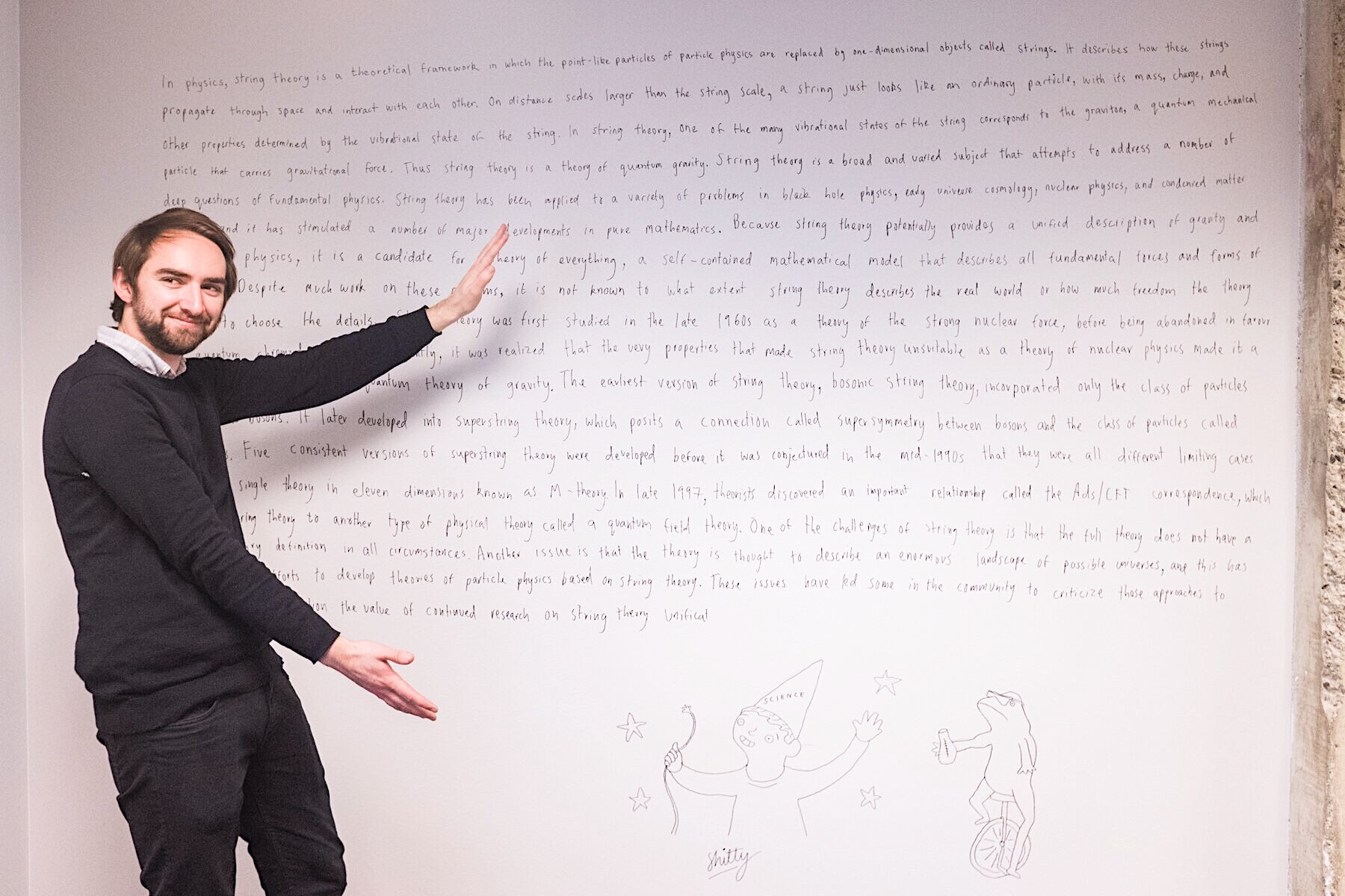 In physics, string theory is a theoretical framework in which the point-like particles of particle physics are replaced by one-dimensional objects called strings. It describes how these strings propagate through space and interact with each other. On distance scales larger than the string scale, a string looks just like an ordinary particle, with its mass, charge, and other properties determined by the vibrational state of the string. In string theory, one of the many vibrational states of the string corresponds to the graviton, a quantum mechanical particle that carries gravitational force. Thus string theory is a theory of quantum gravity. String theory is a broad and varied subject that attempts to address a number of deep questions of fundamental physics. String theory has been applied to a variety of problems in black hole physics, early universe cosmology, nuclear physics, and condensed matter physics, and it has stimulated a number of major developments in pure mathematics. Because string theory potentially provides a unified description of gravity and particle physics, it is a candidate for a theory of everything, a self-contained mathematical model that describes all fundamental forces and forms of matter. Despite much work on these problems, it is not known to what extent string theory describes the real world or how much freedom the theory allows to choose the details. String theory was first studied in the late 1960s as a theory of the strong nuclear force, before being abandoned in favor of quantum chromodynamics. Subsequently, it was realized that the very properties that made string theory unsuitable as a theory of nuclear physics made it a promising candidate for a quantum theory of gravity. The earliest version of string theory, bosonic string theory, incorporated only the class of particles known as bosons. It later developed into superstring theory, which posits a connection called supersymmetry between bosons and the class of particles called fermions. Five consistent versions of superstring theory were developed before it was conjectured in the mid-1990s that they were all different limiting cases of a single theory in eleven dimensions known as M-theory. In late 1997, theorists discovered an important relationship called the AdS/CFT correspondence, which relates string theory to another type of physical theory called a quantum field theory. One of the challenges of string theory is that the full theory does not have a satisfactory definition in all circumstances. Another issue is that the theory is thought to describe an enormous landscape of possible universes, and this has complicated efforts to develop theories of particle physics based on string theory. These issues have led some in the community to criticize these approaches to physics and question the value of continued research on string theory unificat but donโt let this man distract you from the fact that in 1998, The Undertaker threw Mankind off Hell In A Cell, and plummeted 16 ft through an announcerโs table.