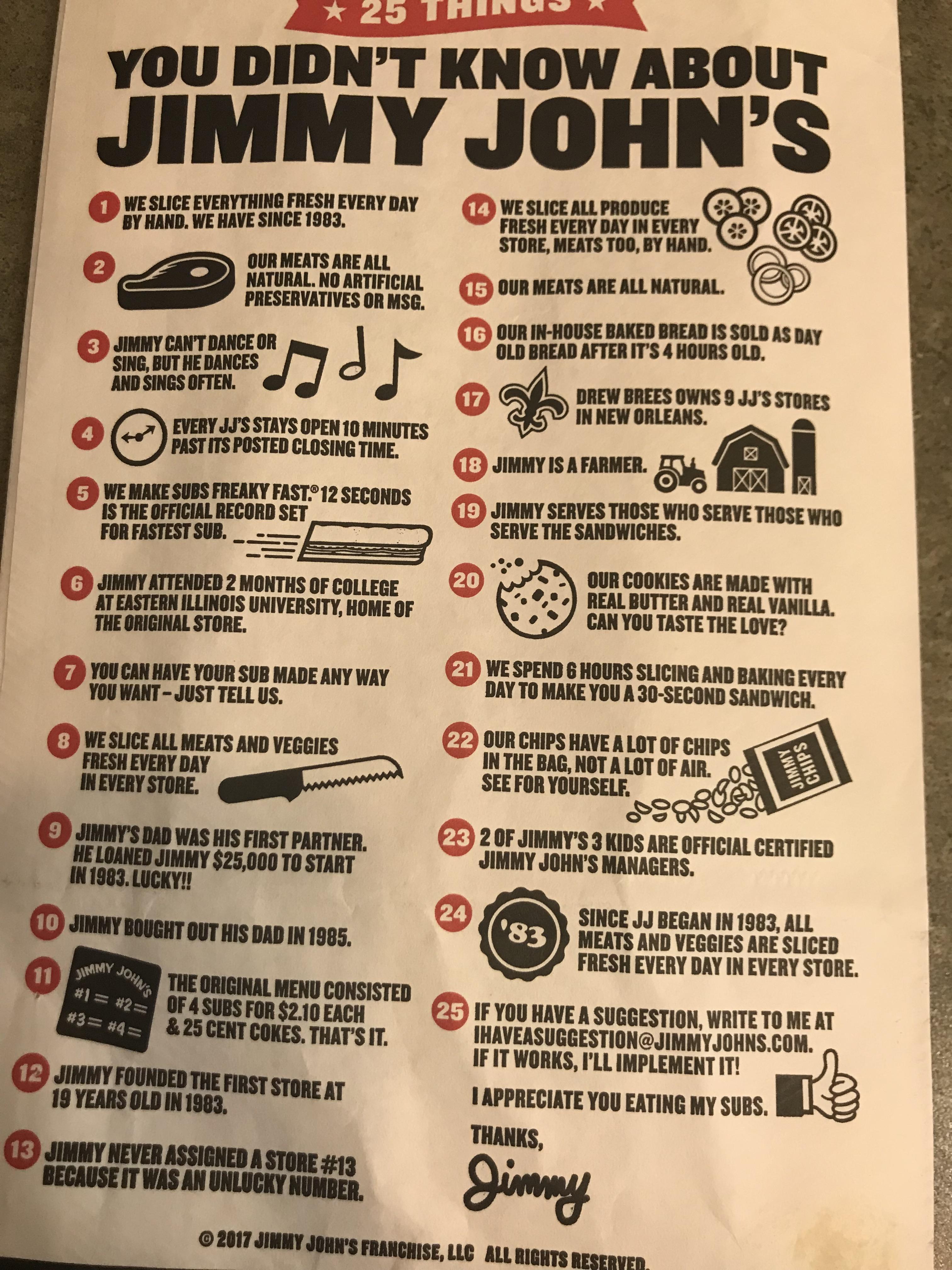 Oh that sounds way better than ours. I mean we have a few cool ones. "No shirt, no shoes, no problem, we deliver" a sign promoting sprouts that looks like a radiation warning sign. "Your mom wants you to eat our sandwiches" is my personal favorite. I think they just have a bunch of Jimmy approved signs in a catalog each local owner can buy from.