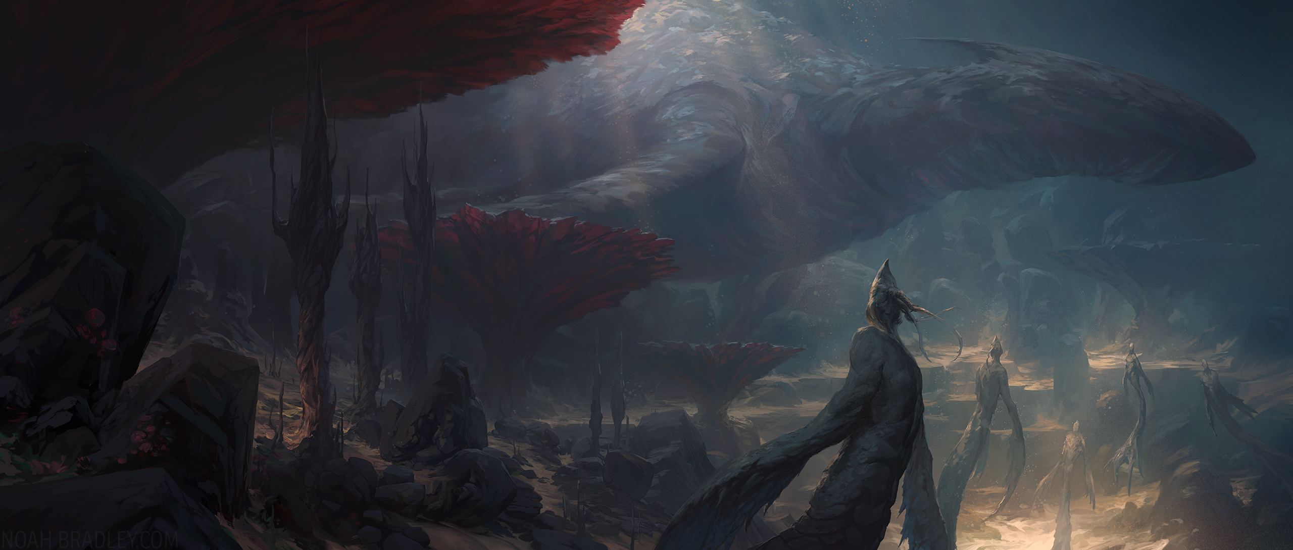 As a fellow illustrator, I'm wondering what made you feel like you needed to change the ground elements so many times. The big whale creature went through a few different iterations, but I feel like that would've been way easier than changing up the background (and foreground) elements that much. Were they just not feeling right, or did you have actual compositional reasons for it?