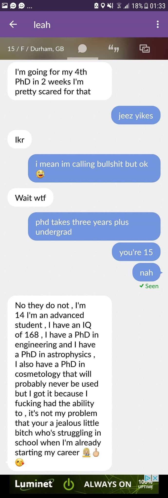 But the bullshit claims 15-year-olds make up are a lot more believable than having 3 PhDs.