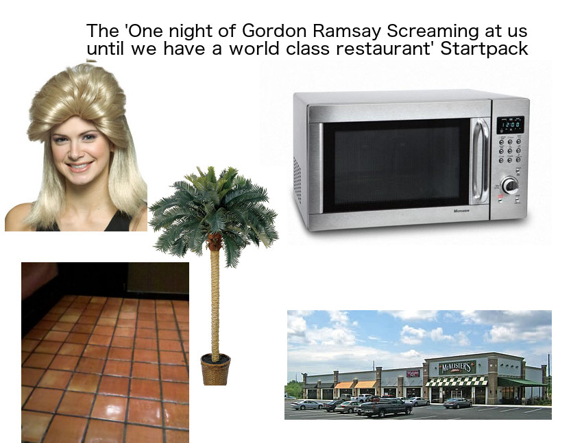 Needs a freezer room full of rotting food (which Ramsay picks up, sniffs, and slops back in the container before saying "fuck me") and cooked meat next to raw meat.