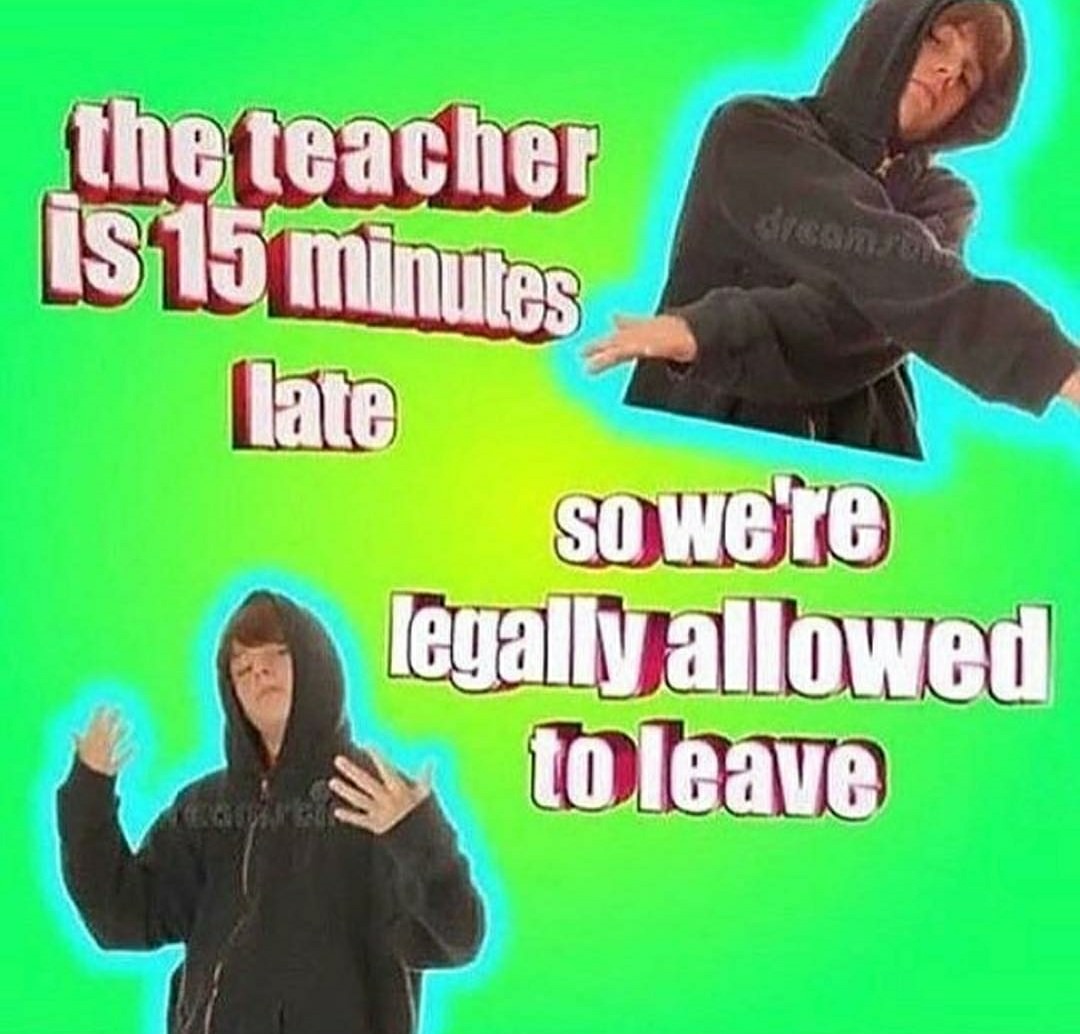 In my school, if the teacher is 10 minutes late the class president has to go do some shit and if the teacher still isn't here we can leave.