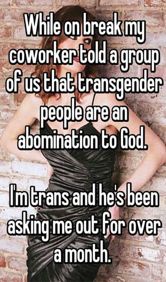 Co-worker: You guys see that hair on Margo's upper lip? Blegh. That dude's transition to become a woman has been super rough- oh shit, here she comes... uh, hi Margo.