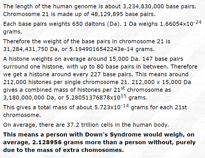 This needs to be upvoted more. The calculation may be right in accounting for the extra weight from all the chromosomes; however it fails to account for the fact that people with Down syndrome will have very different morphology and these will most likely contribute to a lot MORE difference than just the two grams from the chromosome alone.