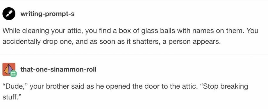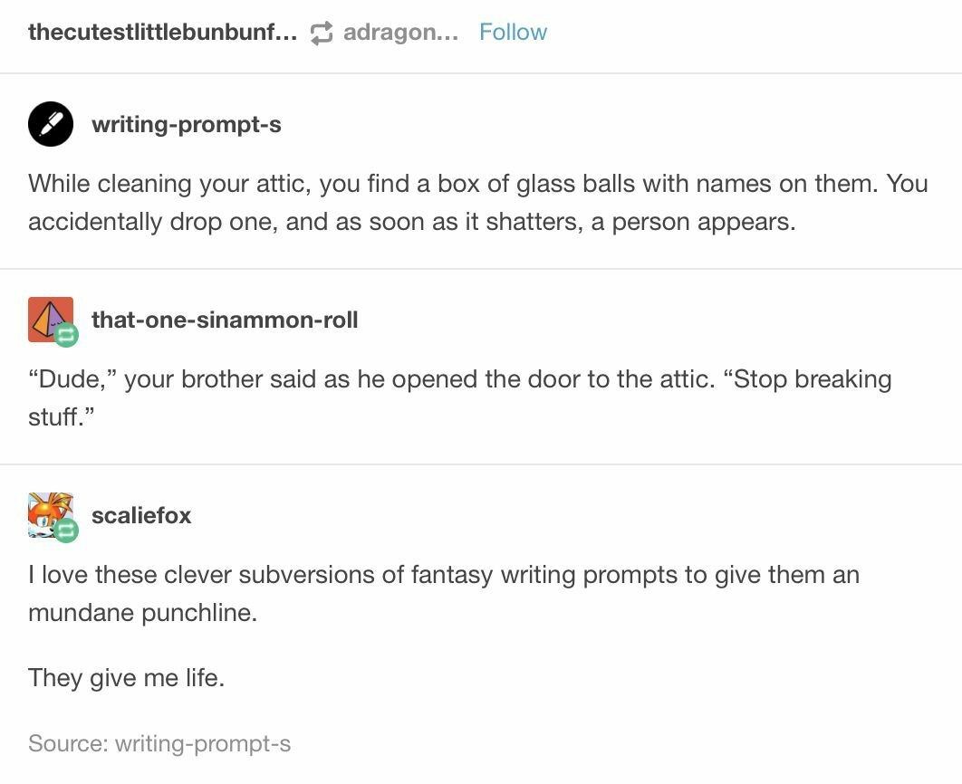 I love these clever subversions of fantasy writing prompts to give them an mundane punchline.